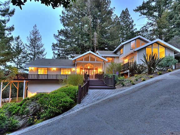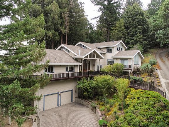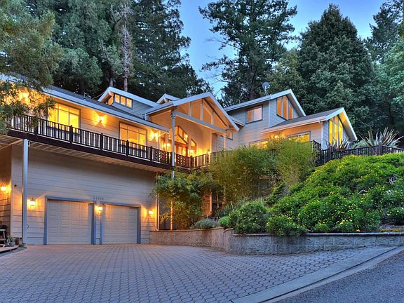 A magnificent 6,000 SF estate on 5.75 acres in a prestigious location just minutes to the Saratoga Village and 20 min. to the heart of Silicon Valley. Set among majestic redwoods with mountain views & city lights. Warm & inviting, you enter through grand Mahogany double doors, leading to an expansive living room with vaulted ceilings, this beautiful home welcomes you with sweeping windows, soaring cathedral ceilings, quality craftsmanship & an abundance of natural light. The floor plan offers the utmost in flexibility with 5 oversized bedrooms, 4 bathrooms, formal & informal living spaces, a dining room, modern kitchen full of light, library with fireplace, office, utility room, family room and a game/media room complete with with dry sauna. Granite, marble & gleaming oak hardwood floors w/ border design inlays, recessed lighting, crown/base molding. Entertain your friends and family on 3,000SF of decking under a canopy of redwood trees. 10 minutes to top Saratoga schools