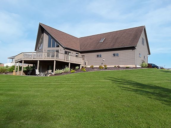 3.81 acres. 192' Long Lake frontage. Main room 22' ceiling at peak. wood floors. 36x24 garage wired with 220 and 100amp box. Garage is also insulated and heated. Partially finished basement stubbed for bathroom. Bonus rooms above garage. Appliances included. Master bedroom/bath/walk in closet. Concrete patio under deck. Path to own 80' dock.