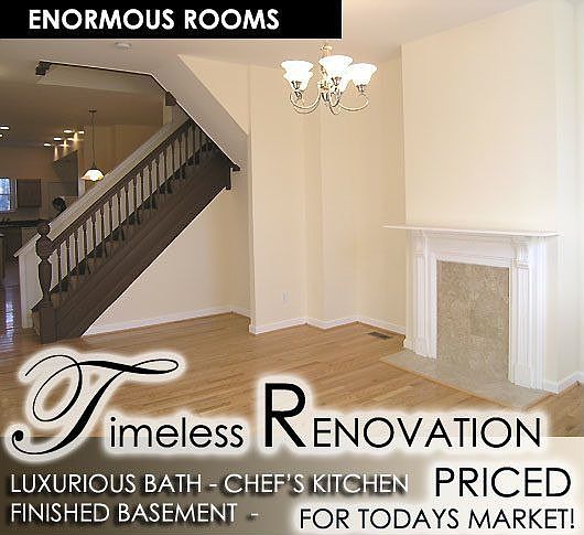 ENORMOUS METICULOUSLY REHABBED ROWHOME W/HUGE BEDROOMS & FINISHED BASEMENT! This home has been completely rehabbed and features: New carpet & hardwood flrs, Updated kitchen, HUGE Bath (10x12) w/whirlpool jets, dual sinks & ceramic tile, Recessed lighting, Lofted ceilings, Excellent closet space, Replacement windows throughout, New plumbing, New 200 amp service panel, & Gardening space in yard!!