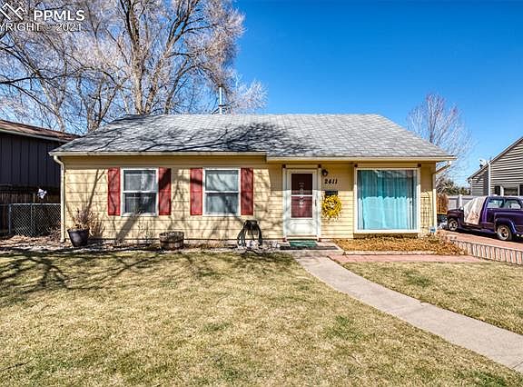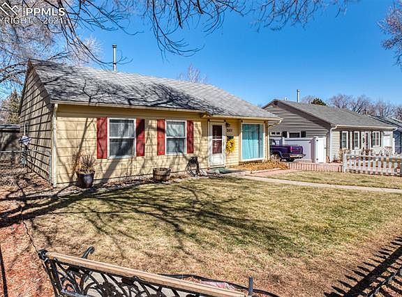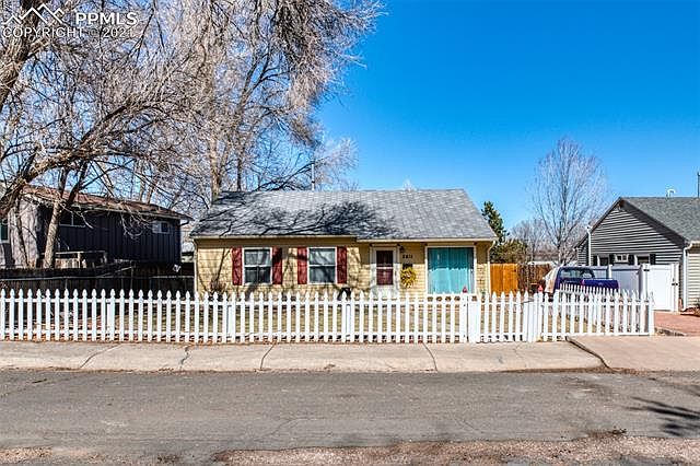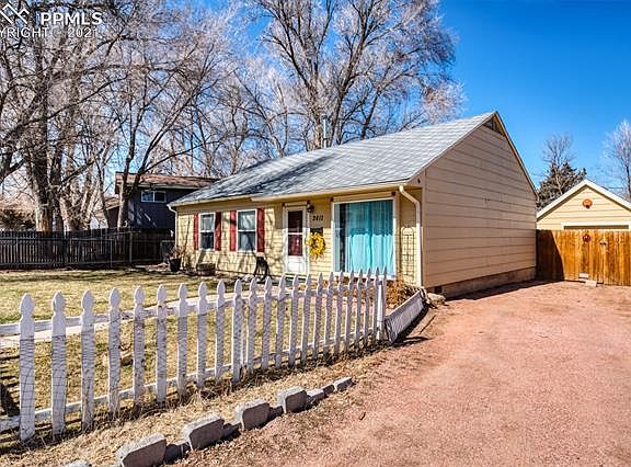Adorable dollhouse-like home with a white picket fence! This 3+1 has a lovely big front picture window, wooden floors, fresh paint, pantry space, laundry area. Bright cozy kitchen has gas stove, newer counters and rear door access to backyard. Also comes with a detached garage and shed in rear. The grass front yard comes alive with flowers and blossoms in the spring and there is more gardening and options for landscaping in back. Spacious front and rear enclosed yards offer safety and storage options - great for pets, BBQ's, recreation, play equipment, etc. Graveled driveway offers plenty of space for your vehicles, yard sales or storage/staging of any kind. Clean, cute and waiting for serious buyer. Great value and curb appeal. Please come take a look. Near Southgate shopping, Tinseltown, Ft Carson, CS airport, I-25 and more!