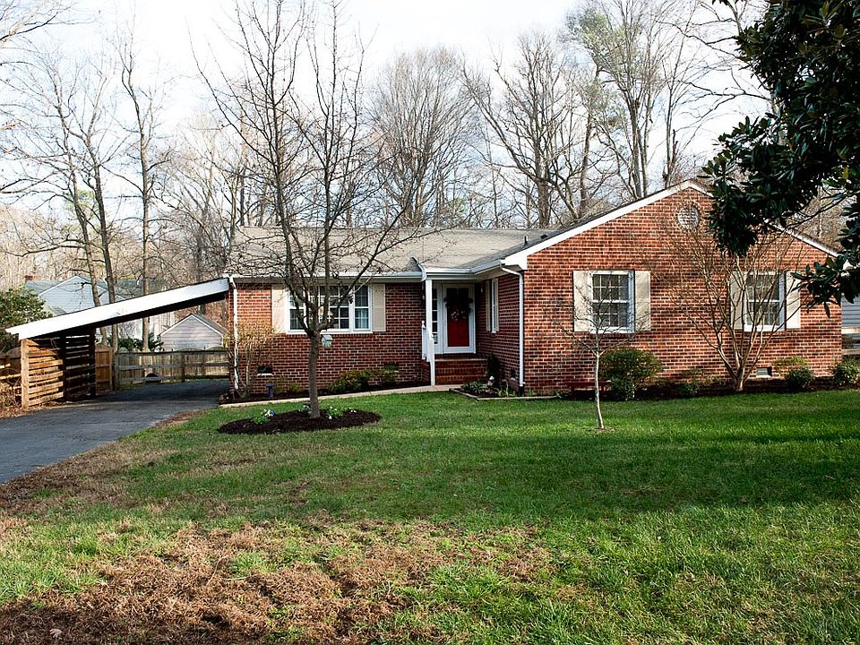 Rare for the area! Nestled by sought after Crown Grant neighborhood. Enjoy one level living with this low maintenance brick home. Great L shaped floor plan with formal dining room, oversized eat-in kitchen with fireplace, large laundry room, and master suite with full bath. Hardwood floors throughout most of the home with newer kitchen floor. Dimensional shingled roof replaced in 2014 & heat pump approx. 5yrs old. Fenced yard, paved driveway, attached two car carport, concrete patio, and detached shed. This home is move in ready!