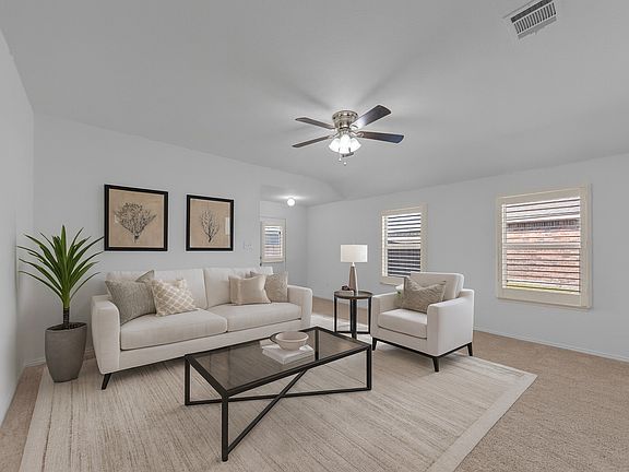 HUGE YARD! RARE FIND with a THIRD OF AN ACRE CUL DE SAC LOT! NEW NEW NEW! FRESH PAINT & NEW CARPET & NEW ROOF - ALL IN SEPTEMEBER 2025! This home is move-in ready! One Story 4-bedroom home in the established neighborhood of Camden Parc. Charming curb appeal of the long driveway, cul de sac lot, and brick and stone façade say 'Welcome Home'! The kitchen features a large island, granite counters, tons of counter space, pantry, and a large dining area. The kitchen flows right in to the living room creating an open concept floor plan that is great for entertaining. Every window in this home features custom interior shutters - a nice high-end feature! Private primary suite overlooking the backyard with ensuite bath - featuring a walk-in shower & large closet! Spacious secondary bedrooms. Full hall bath with built-in shelving for extra storage. 4th bedroom with closet is great flex space for 2nd living area or home office. Past the covered back porch is this AMAZING backyard - SO MUCH ROOM for pets or playtime! 2 car attached garage with extra space for storage. You do not want to miss out on this amazing opportunity on such a special lot!