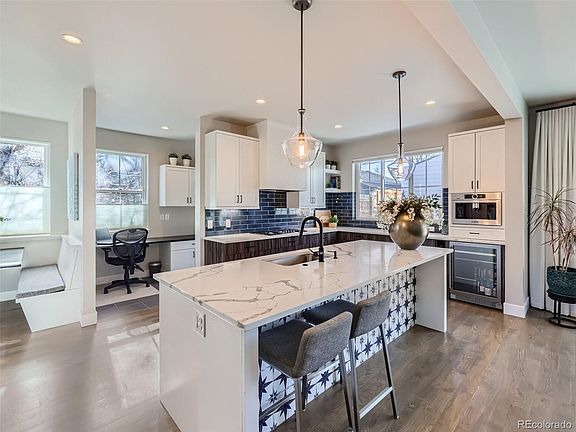 Situated in the heart of Edgewater, enter this move-in ready custom home and experience its bright and spacious interior. The welcoming foyer opens to the formal dining room, ready for large gatherings. Nearby, the chef’s kitchen features built-in stainless steel appliances including wall ovens, wine fridge and espresso machine – be your own at home barista! The kitchen offers custom cabinets, Caesarstone quartz countertops and a 10 foot wide island. You’ll appreciate the handy walk-in pantry and cozy built in breakfast nook. The adjacent mudroom contains a coat closet, built in bench and desk. Relax in the open great room with huge sliding doors and gas fireplace. A large bedroom with ensuite bath complete the first floor. Ascend the iron railed staircase to the wide, skylit upper hallway. The 2nd floor surprises with partial downtown skyline and Sloan’s lake views. With 4 additional bedrooms – any could also be an office, den, craft room or home gym – everyone can have their own space. Find sanctuary in the primary suite that features a large walk in closet. Additionally, the bright ensuite bathroom with double vanity and large shower will make morning routines more enjoyable. Another full bathroom and generous laundry room round out the 2nd level. Below grade, with storage galore, the stand-up height crawlspace with concrete floor really isn’t just a crawlspace after all. Step outside to find 2 separate covered porches and 2 open patios – one features a gas firepit – consider this your al fresco front living room. Opening to the alley, an oversized 2 car garage with walls of built in shelves offers near endless storage. Have confidence in your Class 3 hail resistant asphalt shingles and low maintenance Trex fence. Saunter to restaurants, pubs and shops all less than a 5 minute walk away. Enjoy the small town feel next to the big city and make this home yours! Visit The Matterport Tour at https://my.matterport.com/show/?m=FnXpfk1GYqu&mls=1