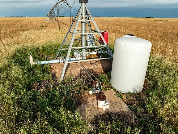 There is a concrete storage tank that the seller built on the farm to pump water into for supplementing the irrigation wells. This tank holds roughly 1,000,000 gallons of water and once filled the seller can pump water to either pivot system from this tank. The system is used to ensure the wells production is uniform while watering crops during the summer and winter!