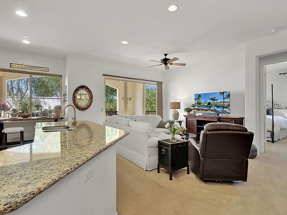 If you are looking for privacy this pride-of-ownership property is it! A great room floor plan with 2 bedrooms plus an office that boasts granite counters, owned solar, a tankless hot water heater, 2 car tandem garage. Use the elevator or stairway to this upper level unit shared by only a few other residents. The kitchen features stainless steel appliances, a gas range, breakfast bar & eating area. A large beautifully tiled balcony extends along the great room and master bedroom perfect for your morning coffee or afternoon cocktails. There are no neighbors behind you, just treetop views and landscaping below in this peaceful setting. The HOA includes use of clubhouse & amenities - pool, aqua classes, aerobic, tai chi, shuffleboard & bocce ball courts, an exercise room, card room, game room, bistro, 9 hole putting green, library, pool rm, ballroom, dining room. Ext. pest control, building insurance incl. earthquake to interior walls, Spectrum Platinum package CATV/Internet, water, trash, exterior building & grounds elevator maintenance, roof & cleaning solar panels 2x's/yr. are also included. A great package of exc. amenities in this gated community near shopping & restaurants!