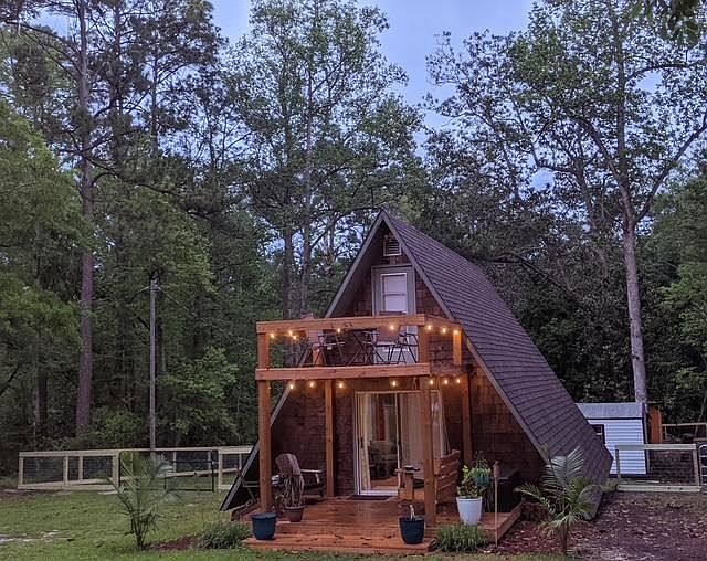 This charming A-Frame cottage is an absolute must-see! Thoughtfully updated throughout and situated on a spacious, private lot, it offers the perfect blend of comfort and outdoor living. Step onto the inviting two-story front porch — an ideal spot to unwind and take in the surrounding nature. Inside, the bright and open living area flows seamlessly into the dining space and kitchen, complete with a breakfast bar. A spiral staircase leads to the private upstairs bedrooms, each with access to the upper deck overlooking the property — the perfect place to enjoy your morning coffee or relax with a good book. Out back, a generous deck provides plenty of room for lounging, grilling, or hosting your own private tailgate. Just off the deck, the she-shed/office houses the laundry area, offering flexible space for work or hobbies. A separate storage shed/workshop sits at the far end of the property for even more convenience. The home is equipped with a private well and septic system, plus a new well pump and water heater for added peace of mind. The fully fenced yard includes two access points, making yardwork — and life with pets — a breeze. Whether you're looking for a cozy primary residence or a fantastic vacation rental opportunity, this property delivers. Located just minutes from the public boat ramp and lake access, it’s the perfect place to start living your best Lake Life.