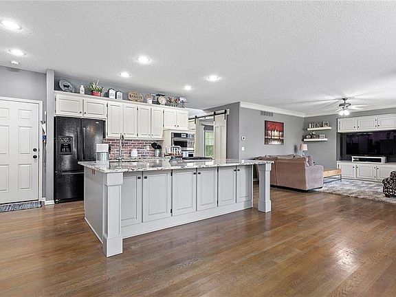 Wonderful in Western Lenexa! Located Across the from the Park Provides Great Views. Step Inside To View This Newly Remodeled Main Level with All The Right Farmhouse Touches, Light and Bright. An Expansive Open Floor Plan Provides an XL Kitchen Island, Added Walk In Pantry, Hearth and Great Room, Sparkling Hardwoods, Granite, and New SS Appliances Including Convection Oven/Micro, Oven and Warming Drawer. Upper Level Boasts Lg Bedrooms, Walk-Ins, and Laundry Rm. Master is Massive w FP; 4th Bedrm Can Be 2nd Master.