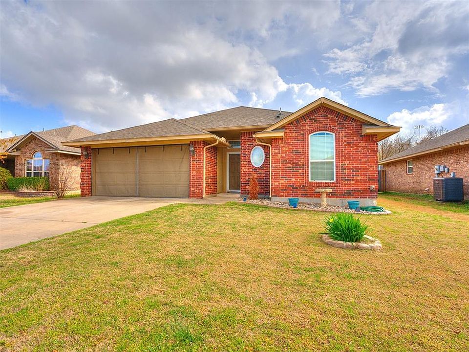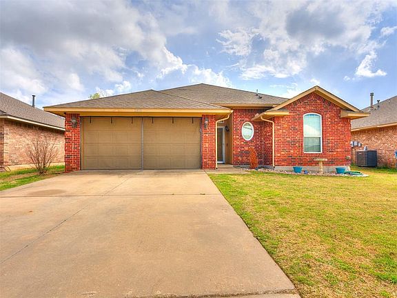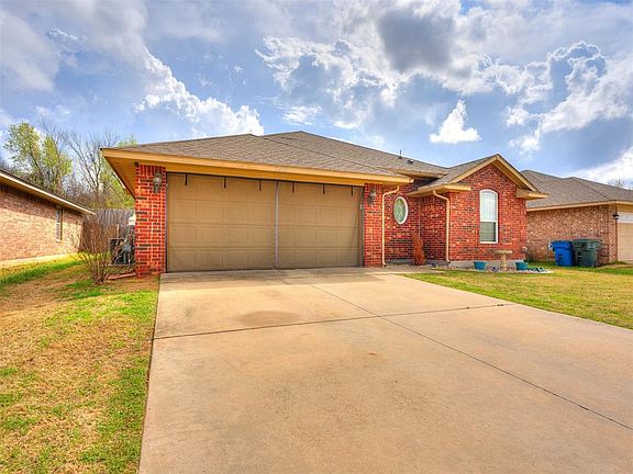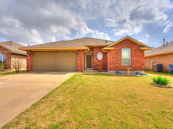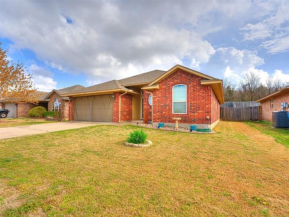Welcome home! This stunning 3-bedroom, 2-bathroom residence is the epitome of style, comfort, and convenience. Nestled against a greenbelt, you'll enjoy the peace and privacy with no rear neighbors. With a smart thermostat, two outdoor cameras, and a doorbell camera, energy efficiency and security are at your fingertips. The kitchen overlooks the spacious living room, complete with a generous pantry and ample storage. Picture-perfect evenings await by the gas fireplace in the living room, adorned with crown molding and wired surround sound system for the ultimate entertainment experience. The bedrooms are thoughtfully separated from the primary suite, offering privacy. Conveniently located just minutes away from Tinker Air Force Base, Boeing, and other major attractions, this home provides easy access to I-40 and I-35. Plus, enjoy the added bonus of a brand-new dishwasher, and the refrigerator, washer, and dryer included—perfect for families starting their journey without the hassle of buying appliances. Shed in backyard is 8x8.