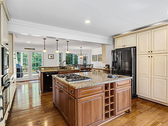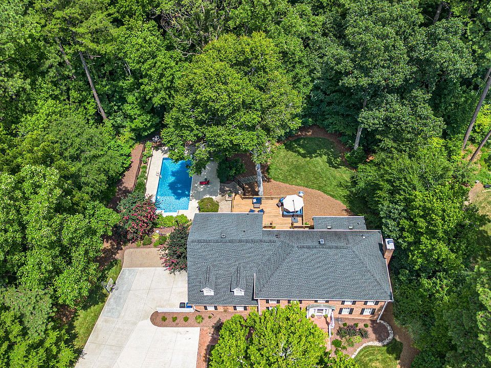 Welcome to this stunning five-bedroom, three-bathroom home in Prime North Raleigh, featuring a finished basement and an inviting in-ground swimming pool. Perfect for entertaining both indoors and outdoors, the home offers a welcoming entry and an open, flowing floor plan. The spacious kitchen spans from the front to the back of the house, overlooking the two-tiered deck, beautifully wooded lot, and the 30,000-gallon in-ground pool. The dining room opens to the living room and leads to a sunroom, seamlessly connected to the decks and other outdoor features. The main floor includes a bedroom and full bathroom, providing flexibility for hosting guests, in-laws, or a nanny. The finished walkout daylight basement offers outside access and is ideal for work or play. Upstairs, an oversized bonus room awaits, complete with a wet bar, fridge, built-in bookcases, and dual access from both floors. The upper level also hosts four additional bedrooms, including the master suite. Nestled on nearly an acre of beautifully wooded land on a quiet street, this location offers tranquility and privacy. Conveniently located just three minutes from 540, the home provides easy access to outstanding amenities, including the new Trader Joe's, and is surrounded by diverse shopping options—all without city taxes. WELCOME HOME!