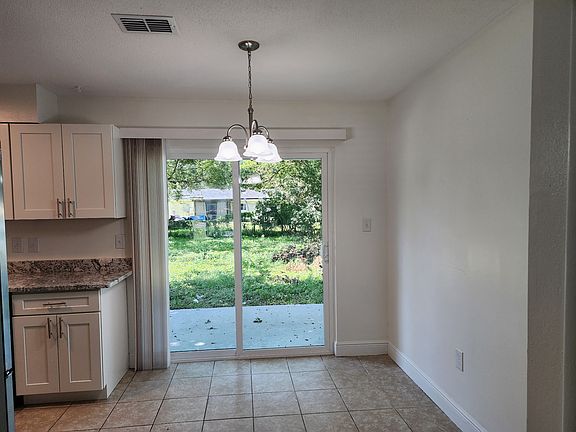 The dining room opens through sliding glass doors to an enclosed, all-weather porch, leading out to a large screened patio and expansive backyard ideal for outdoor gatherings or enjoying quiet Florida evenings.