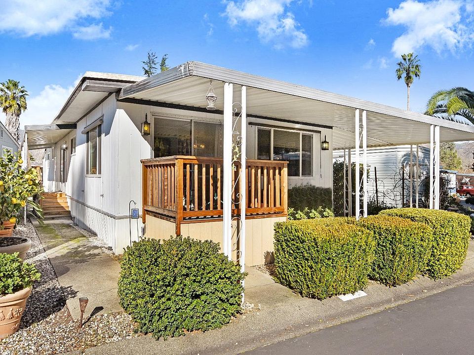 Beautiful and light-filled 2 bd. 2 full bath Napa Valley mobile in leafy 55+ park with a view of Mt. St. Helena from the spacious master suite, which includes a large walk-in closet. Separate family room and large bright living room. Sparkling new flooring and paint throughout, brand new high-end dishwasher, disposal. Dining room shines with built-ins and a sophisticated light fixture. This home includes special features such as rent control, two driveways, a large screened-in back porch, a cozy front deck and spacious private patio. Four sliding glass doors each open to inviting outdoor spaces. This home is close to the modern clubhouse, pool, spa and exercise room, and is a lovely short walk to downtown Calistoga.