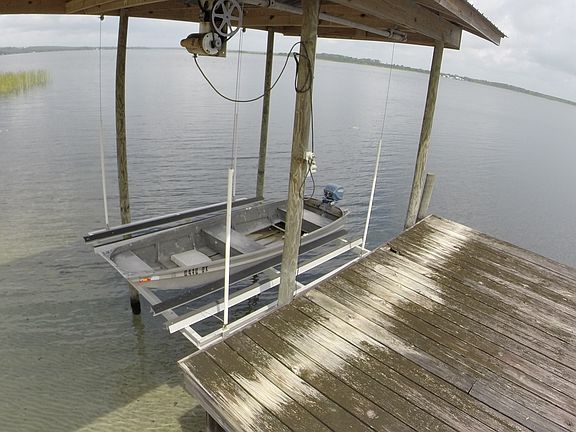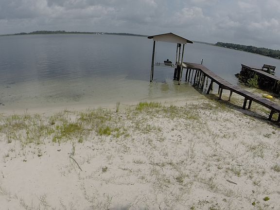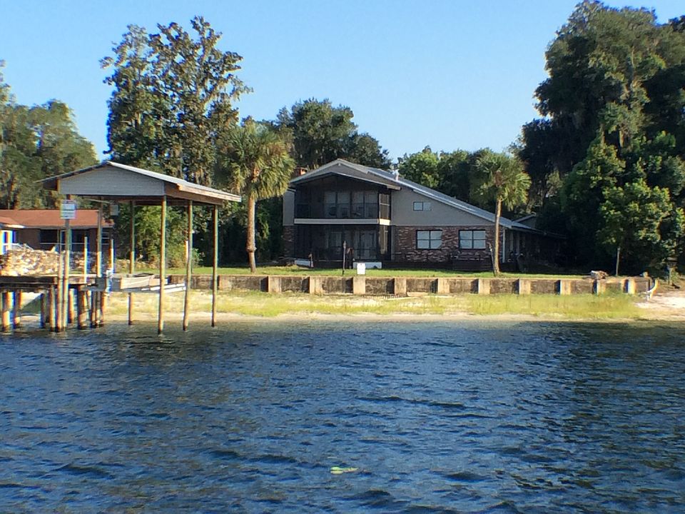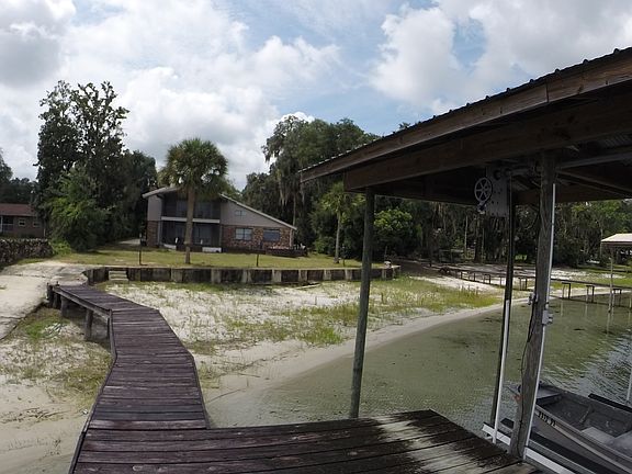 Stunning sunrise and sunset views from this beautiful 1.5 story Lake Kerr home with 100' of white sand beaches. As you enter the foyer, you are treated by open floor plan with carpeted great room, including fireplace, and views of lake with double french doors leading to spacious screen room. Heading left you will notice the natural oak wood floors throughout dining room, sitting area leading to cozy kitchen and eat-in-kitchen area with great views of lake from all windows. There are 3 bedrooms downstairs with smaller main suite. The stairs lead to a fabulous upstairs main suite with soaring vaulted ceilings and double french doors leading to 10 x 20 screen. Outside is 4 car detached garage with fishing cleaning station on back. Dock w/ covered boat lift and private boat ramp with concrete