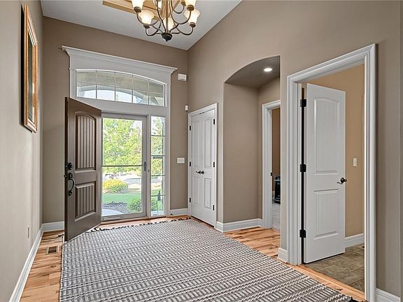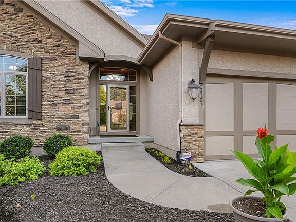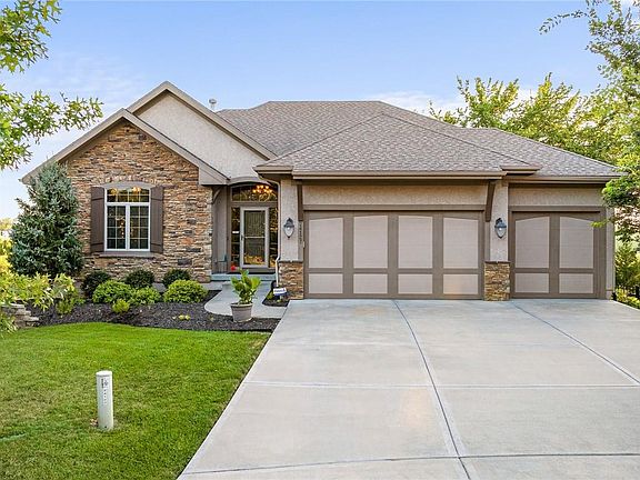 This beautiful Chesapeake III by Hillman Homes is loaded with all the extras and priced way below reproduction costs. 4 bdrms, 3 full baths, finished walk-out basement with family/media, rec room, and a full bar with over 3800 sqft of finished living area. Upgrades include; Multiplank hickory hardwood floors, formal dining, breakfast room, open kitchen with granite, stainless steel appliances, including gas range and all appliances stay including washer/dryer and fridges. Huge walk-in pantry, custom cabinets with under/over mount lighting, mudroom with boot bench, all seasons room with fireplace and heating & cooling, whole house sound system with speakers & subwoofer, smart technology with security and fire. Oversized master and master bath with walk-in shower and separate tub, double vanities, and laundry located off the master closet. All secondary bedrooms are generously sized and offer ceiling fans, walk-in closets, and blinds throughout. The finished lower level is an entertainer's paradise offering a full bar with a kegerater, media room, game room, and 3rd full bath. Still plenty of storage with built-in shelving and a storm closet and/or safe room. Sprinkler system, tons of landscaping, covered storage, stubbed for gas, future pool solar panels, and firepit. Extra features include; custom built-in doghouse, a garage with inclined shelving ND LED lighting, battery back-up IQ openers, damper-controlled zoned HVAC, a completely fenced yard, located on a culdesac, and just steps to award-winning Olathe schools. Forest View Elementary, Mission Trail Middle, and Olathe West High School. Great opportunity to get into one of Olathe's most desirable neighborhoods.