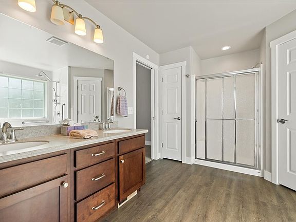 Amazing ranch-style home, zero-entry! Open & inviting kitchen, living, and dining. This single-level home has an abundance of natural light. Kitchen has ample cabinet space, window sink, stainless appliances, and solid surface counters. Primary suite is generously sized with walk-in closet, dual vanities, and two walk-in showers (seller is giving credit to put a tub back in). Large private backyard with shed to meet all your needs. This home is a must-see! Info deemed reliable but not guaranteed. Buyer/buyer agent to verify.