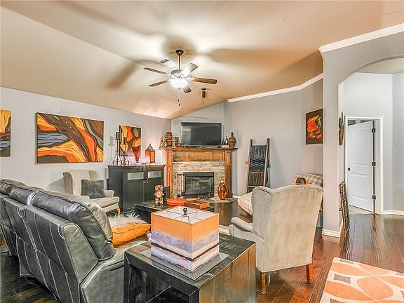 Back on the market due to buyer's financial considerations. Gorgeous split 3bed 2bath home. Front living features fireplace, ceiling fan & engineered hard wood floors that extend throughout the hallway. Second living is located off kitchen with wood-tile flooring, ceiling fan & direct access to the backyard. The backyard is amazing! The owner has created a third living space for your outdoor enjoyment complete w/ wood-tile patio floors, screened in covered patio with extra lighting, misting system. Master bedroom is spacious w/ bay window and ceiling fan. Master bathroom has garden tub, dual vanity, dual walk-in closets, tiled shower! The guest bedrooms are an ideal size and 1 has a ceiling fan. Spacious kitchen w/ pantry, under & upper cabinet lighting, breakfast bar, & granite countertops. A few enhancements include inground path lighting, low maintenance perennial garden in the back with water hose sprinkler system, storm shelter in garage, year round eave led lighting with remote.