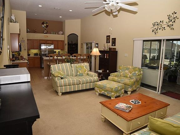 This is the perfect house for entertaining!!! Enter through the screen entry, front hall closet, the greatroom is open to the large kitchen, both with large sliders to the lanai. Kitchen features walk in pantry with wide shelving from the floor to the ceiling. Breakfast bar, under cabinet lighting, stainless appliances and lots of counter space. Large dining room with sliders to the enclosed lanai. Lanai has ceramic tile floor, tinted sliding windows, designer blinds that go either up or down and french doors to large screened in Patio. Open the doors and have the party flow from outside in!!!! Enjoy the park like setting with no direct rear neighbors!! Large master bedroom with double closets and master bathroom with double vanities and large walk in show with new grout. Guest bath with shower/tub combo and linen closet. Guest room is bright and has lots of closet space and a den with extra high ceilings. Large laundry room with lots of storage, garage is oversized with lots of storage and room for a golf cart. New a/c 2011.The Plantation features beautifully manicured lawns, cascading waterfalls, lush palm trees, 24-hour staffed security, and amenities and activities to fit every taste, interest and budget. Residents enjoy three well-equipped clubhouses, three swimming pools, spring fed fishing ponds and much more. Scenic walking and biking trails that meander through the neighborhoods of the broad community. 30-45 minute drive to all Orlando attractions!