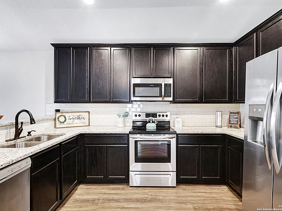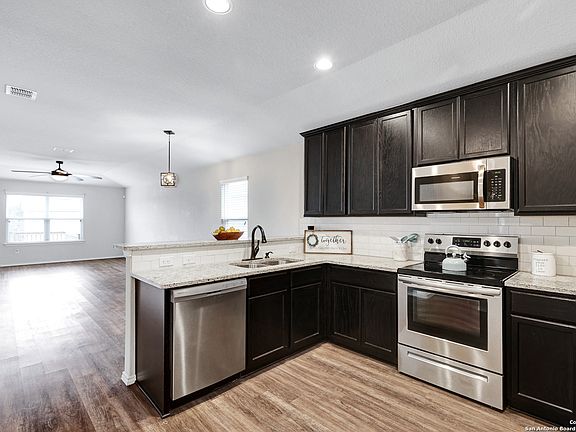 Exquisite Home in Horizon Pointe! Perfectly located in Converse, this home is just minutes from military bases, downtown San Antonio, and essential shopping areas. Built in 2018, this single-story property boasts 1,616 sq.ft. of well-designed living space. The open floor plan features a dedicated dining room, spacious living room, and a large kitchen equipped with modern amenities including an electric range, HVAC, and a hot water heater. An additional room offers flexibility as an office, gym, or playroom. The master suite is a true retreat, highlighted by a large nook for added space and a substantial walk-in closet. High-quality finishes include granite countertops in the kitchen and bathrooms, vinyl plank flooring, recessed lighting, and carpeting in the bedrooms. Neutral paint colors, blinds, and ceiling fans throughout add a touch of elegance. Enjoy privacy with no backyard neighbors and added outdoor features like a shed, a fire pit, and a custom fitted railing on the back porch. This home is a short walk from the community amenity center, which includes sports courts, pool, walking trails and more. A blend of convenience, quality, and comfort makes this home a must-see!