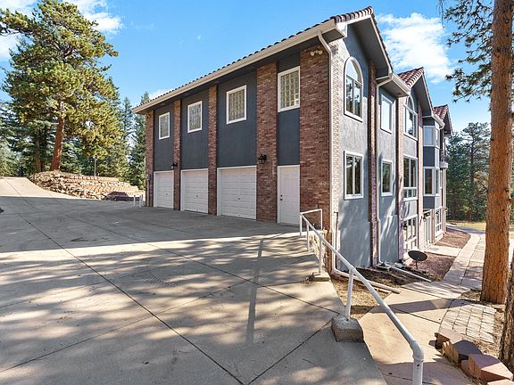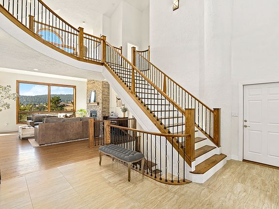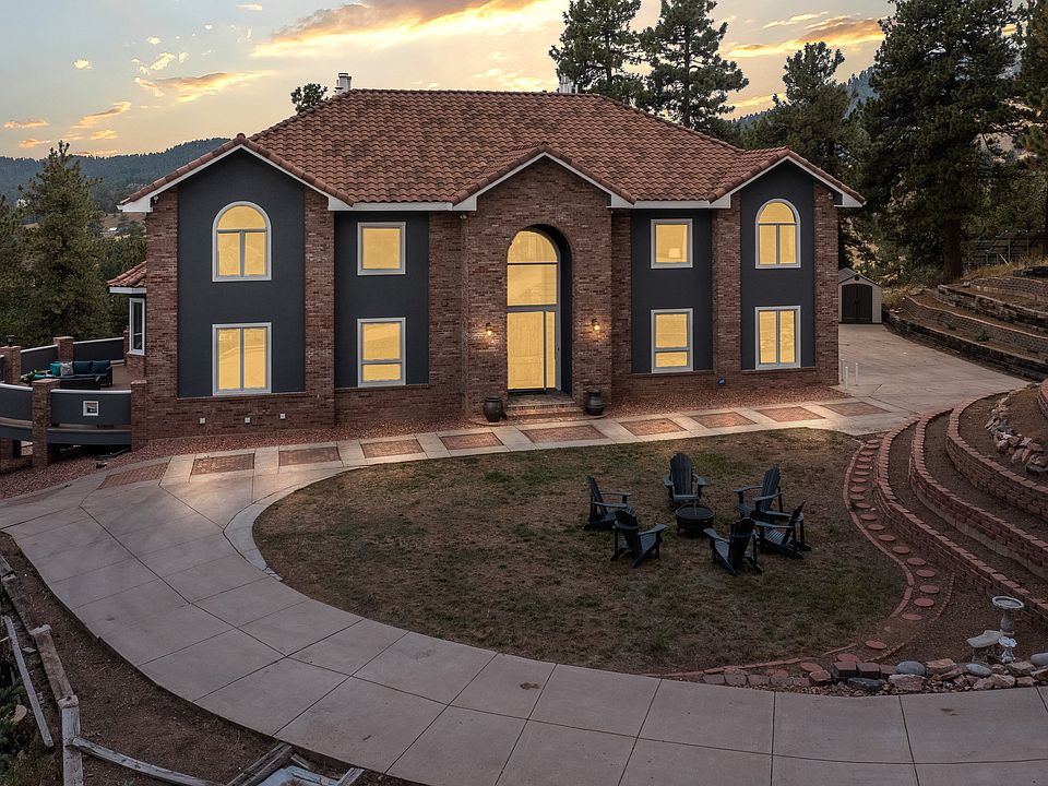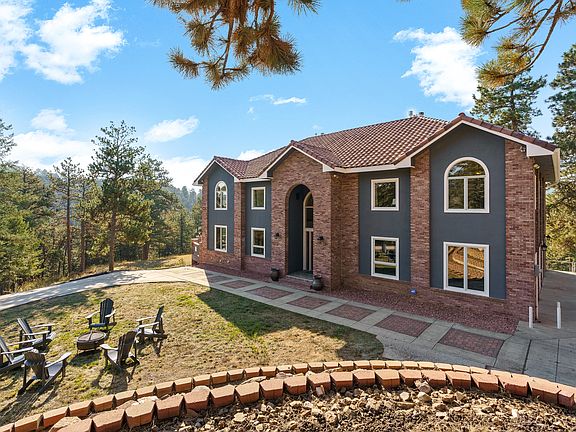 Lookout Mountain Estate on 4.7 acres offers peaceful, private, retreat 30 minutes from downtown Denver. Experience a breathtaking sense of arrival as you enter the home under 25' ceilings with skylights cascading sunlight over the grand staircase. Oversized windows offer views from every floor. All secondary bedrooms live like primaries, featuring walk-in closets and newly remodeled private baths. The interplay of rooms and terrace on the main level make the home perfect for entertaining. A bright study cleverly positioned by the main entry is a perfect home office, offering built-in floor to ceiling shelving concealed behind handcrafted pine doors. The gourmet kitchen is surrounded by views, features a sunny breakfast nook, generous island, walk-in pantry, stainless appliance suite, stunning granite countertops and designer tile backsplash over luxurious custom cabinetry. A spacious family room directly adjacent the kitchen offers a cozy fireplace and ample lounge space. The living room opens under tray ceilings with fireplace ambience and a window wall offering views of horses on a grassy knoll and the iconic "Sleeper" house on a hill above. Ascend the staircase for yet another breathtaking moment as you discover a spacious observation lounge offering views of the valley below from the highest point in the home. The primary suite is positioned for privacy, and features vaulted ceilings, generous sitting room, private balcony and 5-piece resort style bath. Two secondary bedrooms and a laundry facility complete the upper floor. The walkout basement gets ample light, and features an expansive rec. room, kitchenette, workout room w/gym flooring, 2nd laundry room w/storage, and 4th bedroom w/ensuite. Just outside is a newly installed hot tub and deck. A-2 zoning offers exciting options for additional structures, and there is level ground on which to build. Additional access to back of property from Rockland Rd. 3 ski resorts within approximately 75 minutes!