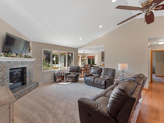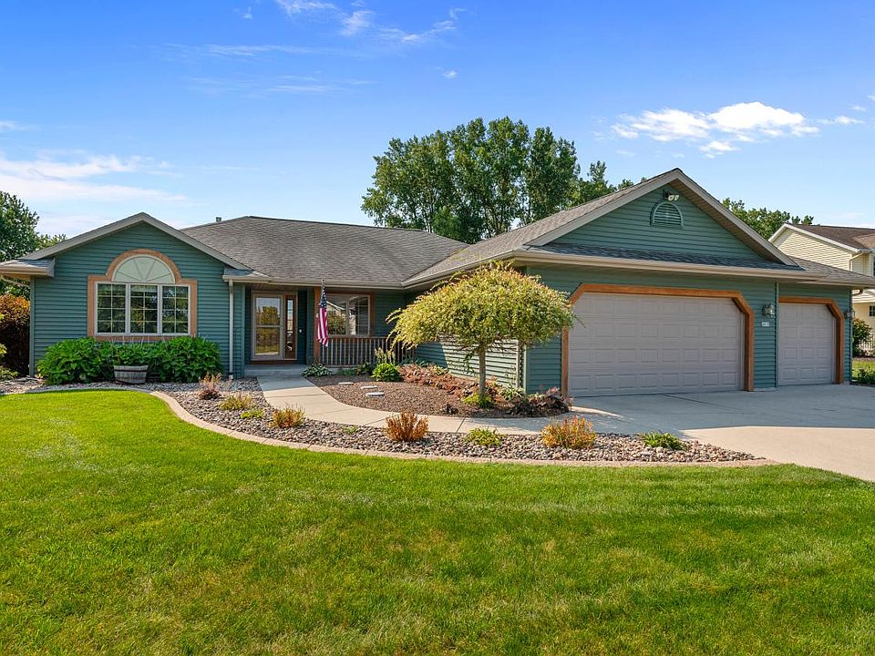 A rare gem in the coveted Hidden Creek neighborhood! 4-bedroom ranch home in the Town of Sheboygan with low taxes set on a .76-acre lot in a cul-de-sac! Split bedroom design + upgrades throughout! 8-year young custom kitchen featuring hardwood floors, pull out/soft close drawers, stainless appliances, gas stove, breakfast bar & Quartz counters! Delightful dining has window walls facing south overlooking mature trees, garden area & a most impressive brick patio! Perfect for ample seating, grilling, and firepit chat. Beautiful berms, spacious greenery + storage shed w/ concrete floor. Custom tiled design entry, vaulted ceilings in great room + tiled fireplace. 1st floor laundry + 3 lockers + 3 car garage with stairs to basement. 5-year young lower-level rec space, wet bar, bedroom & bath!