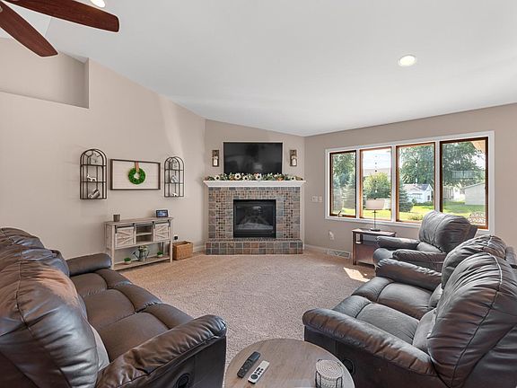 Tiled fireplaceLower-level rec spaceWet barQuartz countersWindow wallsVaulted ceilingsGas stove