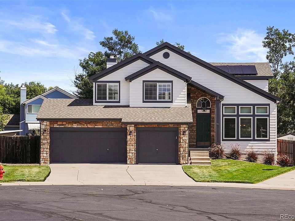 Modern farmhouse located in the desirable Green Mtn Village neighborhood. This beautifully renovated property offers a combination of modern updates and classic charm, creating the perfect space for comfortable living. The family room boasts large windows that flood the space with natural light, highlighting the gorgeous hardwood floors and warm grey tones. The heart of this home is the remodeled kitchen, showcasing modern Calacatta Everest quartz countertops, sleek white cabinetry, composite sink, and subway tile backsplash. The island is the perfect place for family and friends to gather and the adjacent dining area is perfect for dinner parties. The open and airy living room features vaulted ceilings and a fireplace, creating a bright and inviting atmosphere for enjoying quiet evenings. The natural flow from the living space leads to a spacious deck, allowing for seamless indoor-outdoor living. Expand your entertaining options or soak up the Colorado sunshine in a private outdoor oasis. Large concrete pad provides boat or RV storage, with a gate for easy access. Retreat to the spacious primary suite with a private ensuite bathroom and ample closet space. 2 additional well-appointed bedrooms offer versatility and space for family, guests, or home office needs. Additional highlights include a main floor powder room, a finished basement with new carpet, a laundry room, and ample storage space. The 3-car garage offers convenience, while the wide and long driveway allows extra parking. Located in the desirable Greent Mtn Village neighborhood in Lakewood, this home is steps away from Coyote Gulch Park. Enjoy the outdoors at the nearby Bear Creek Lake Park and Red Rocks Amphitheatre - or take advantage of the proximity to the Rocky Mountains for skiing. Sonos and Lutron with automated shades - and smart home features that allow you to turn on and off all lights from one switch. Owned Solar Panels provide energy savings. Hurry, homes like this don't last!