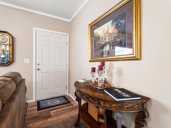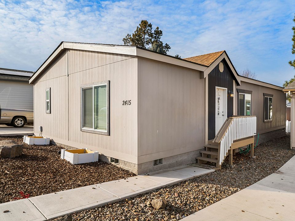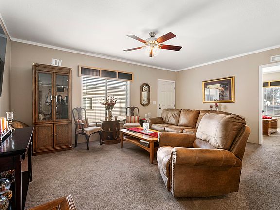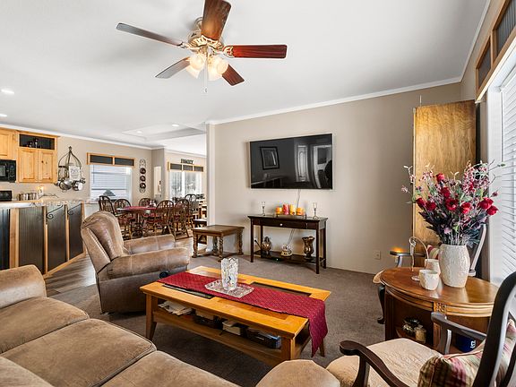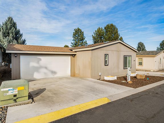 Beautiful home located in Aspen Creek Manufactured Home Park. This home offers an open floor plan with a beautiful kitchen featuring black appliances, and a large island. It has 3 bedrooms and 2 full baths. The primary bedroom is separate from the other 2 bedrooms and features double sinks and a walk in closet. It has a spacious laundry room that is attached to a double car garage. Step outside and enjoy a spacious back deck that overlooks a creek that runs behind the back yard. (It is a seasonal community water feature) It also has a spacious fenced area. The community amenities include a clubhouse and the HOA covers road maintenance, sewer, water and landscaping in the common area. This a beautiful, move-in ready home. Don't miss out!!
