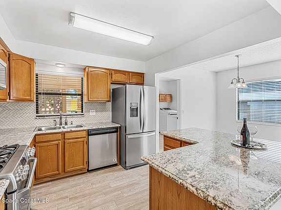 This 4-bed, 2-bath home boasts a range of recent updates, making it move-in ready. The master bath has been remodeled, and the hall bath updated. New wood-look tile flooring flows through the main living areas, complemented by fresh granite countertops in the kitchen and stainless-steel appliances. The interior has been freshly painted, and the water heater was replaced in the interior laundry room. Both bathrooms, kitchen, and laundry now feature PVC sewer lines, new shutoff valves. A new roof, screens and kick plates on the screen enclosure, along with new exterior light fixtures. The home features natural gas, reclaimed water, and is within walking distance of Eastern Florida State College and a County recreation center, with easy access to I-95 and the Beachline & minutes away from the Newly Proposed Brightline Station to Orlando & Miami. Lastly, a new exterior laundry room door allows for a refreshing cross breeze with sliders in the living room, adding to the home's charm.