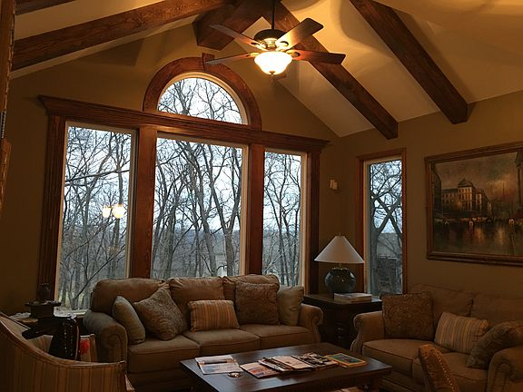 Perfection! This beautiful 2 story shows like a model and is situated on a private treed estate lot! Custom built-ins, arched beams and doorways, NEW CARPET, gorgeous hardwoods throughout first floor, stone fireplace, first floor office, hearth room and more. Spectacular kitchen with a gas cooktop, high end appliances, serving bar, large pantry and tons of cabinet space. Full finished walkout basement with wet bar...55" TV and pool table stay! Screened deck and large paver patio with built in fire pit. Pristine!!