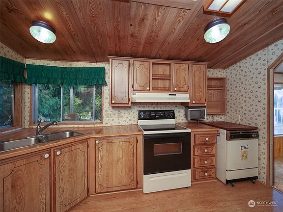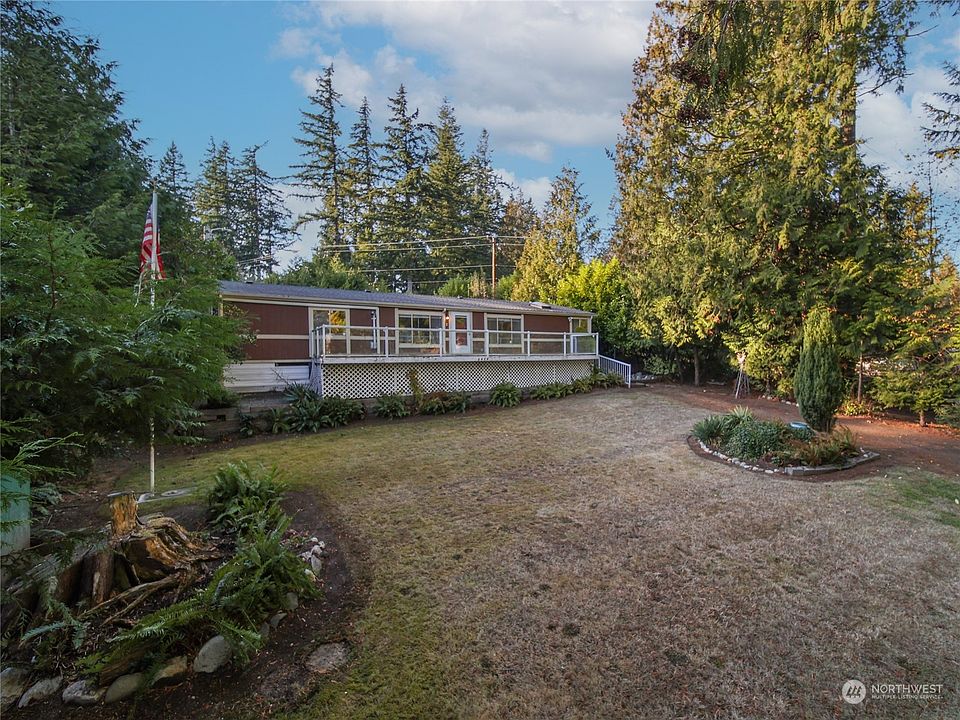 Welcome to your own oasis.This large lot has a view of Lake Ki & private beach access. Enjoy the beautiful sunset views and frequent sightings of deer in your own front yard, & apple trees in the back yard to make your own fresh apple pies. Close to transit, shopping, coffee shops, & restaurants yet secluded enough to enjoy your surroundings. Three bedroom manufactured home can be removed to build your dream house or enjoy the accommodations this property already has to offer.Roof replaced in 2020, heat pump & new furnace installed in 2020.Large garage/shop in the backyard.Driveway parking that is adjacent in the trees,is owned by Dept of Fish & Wildlife the large tree is the border.Seller maintains & has parked there for over 30 years.