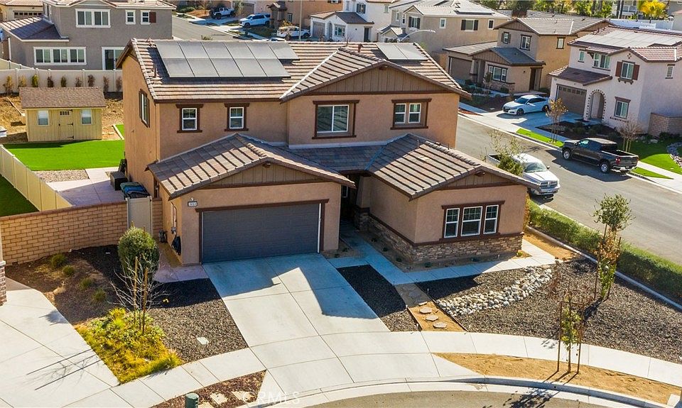 Welcome to your dream home, featuring solar energy and dual EV charging for modern convenience. This stunning 5-bedroom, 4-bathroom, 2,923 sq. ft. home is located in the prestigious Audie Murphy Ranch in Menifee, on a peaceful cul-de-sac, with no neighbors to the left and a short walk to the park.