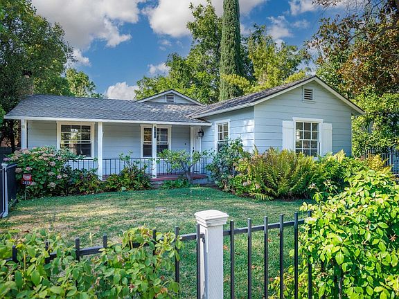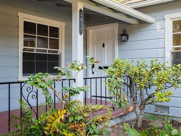 Front Porch elevation with newer comp roof and N/S exposure! Refinished Hardwood Floors and Fresh interior paint! The Entry leads you into the Formal Living Room with fireplace surrounded by bookcases and french doors to the east patio adjacent Formal Dining Room also has French doors to the east patio adjacent U-Shape Kitchen with vintage St. Charles cabinets which offer loads of storage adjacent breakfast area and Family Room with with views and access to the private rear yard, large enough for a pool. Detached 2 car garage with ally access and Mature Landscaping.