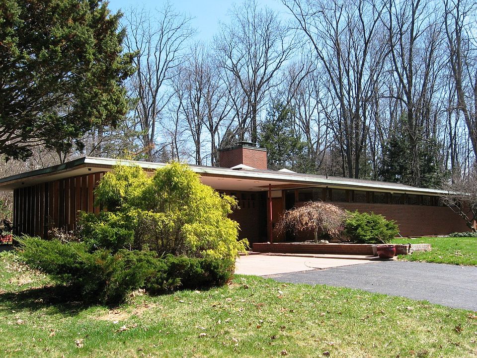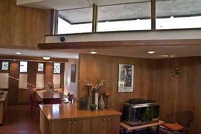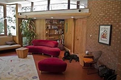 Classic Frank Lloyd Wright style home, designed by Taliesin Fellow. Warm wood walls, clerestory windows, "Cherokee Red" heated concrete floors, built-in furniture and indirect lighting are just a few of the design elements of this mid-century modern home. Living area separates two distinct bedroom wings, providing master bedroom suite privacy. Octagonal living room w/ vaulted ceiling, copper hooded corner fireplace, window wall with views to beautifully landscaped 1/2 acre yard. Formal dining room, large study, updated kitchen.