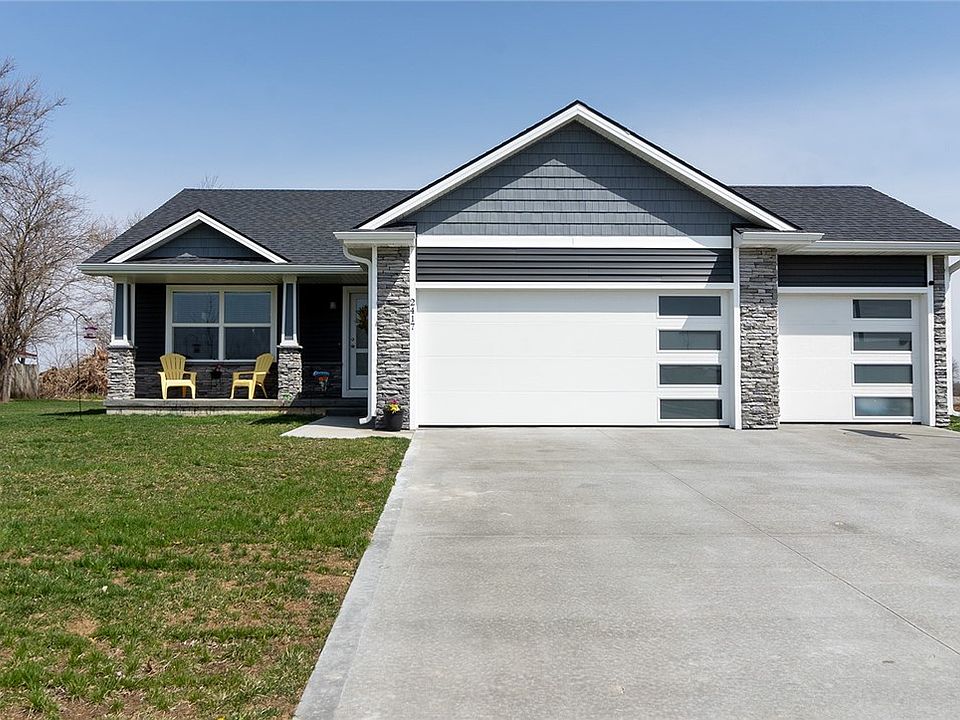 Step inside this LIKE NEW bright and spacious ranch home on a third of an acre lot with a tax abatement still in effect until 1/1/2027!!! This home starts with a front porch, perfect for morning coffee, an extra bright living room area with an open concept to kitchen and dining in which the owners added extra windows to give more light. The kitchen is large enough for island seating along with a dining table area as well. Down the hall you'll find the full main bath, two bedrooms, one with a walk-in closet, the master suite with a beautifully tiled shower, dual sinks and an extremely large walk-in closet. Laundry finishes off this floor with ample storage as well! Downstairs is large and open and some framing and drywall has been started to finish it out, stubbed for a full bath as well! Out back you'll walk out to a nice sized patio and privacy with the only neighbor separated by trees! The well-lit 3 car garage finishes this home off nicely!