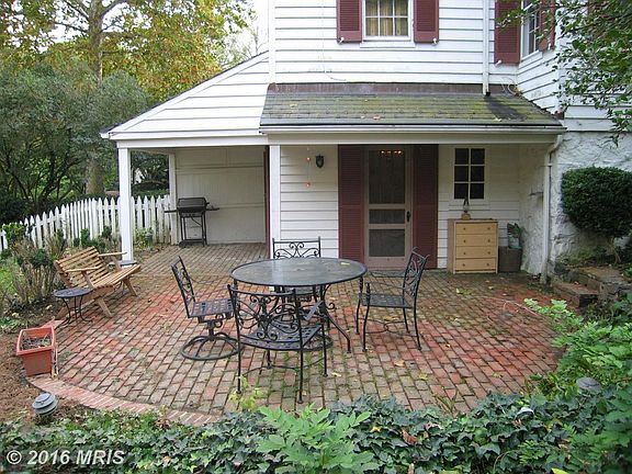This home backs to Gwynn's Falls in Historic Dickeyville. Fresh Paint and new carpet. Updated kitchen maple cabinets & stainless steel appliances. Updated bathroom. Library with built-ins, 2 fireplaces, Wood & brick floors, crown molding, spiral staircase & dining room with french doors leading to private brick patio all lend character and charm to this unique property.