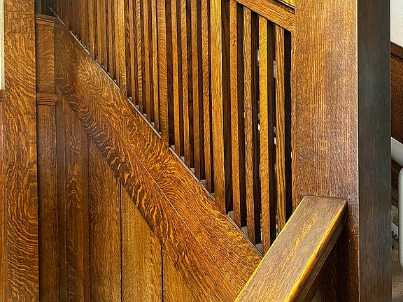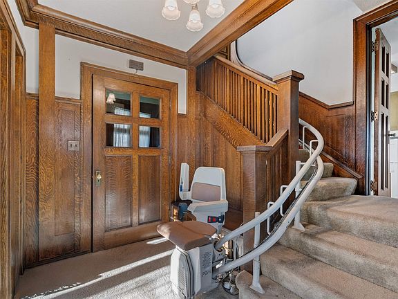 - Description: Built-in bench, original crown molding, wainscoting & wood staircase, closet, "servant's entrance" to kitchen & basement.
