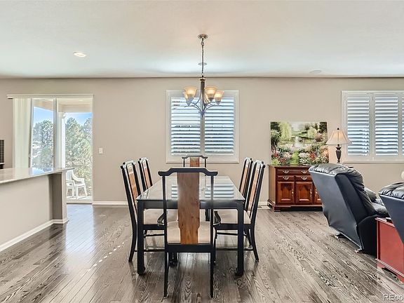 This beautiful ranch home is located on a quiet cul-de-sac and backs to open space and trails. The award winning picturesque Red Hawk Ridge Golf Course is only a short walk on the walking trail located behind this home. This home has upgraded hardwood flooring on the main level, plantation shutters, custom closets and built-ins. The kitchen features upgraded hardwood, slab granite, a beautiful tile backsplash, stainless appliances, and a spacious pantry with custom built-ins. The open floor plan great room features upgraded hardwood, surround sound speakers, a gas fireplace, and a ceiling fan. The Primary bedroom has a custom walk in closet and a private master bathroom. There are 2 additional bedrooms on the main floor. The main floor study / office includes the custom built-in desk. There is a large finished area in the basement that will accomodate a family room and a game / media room. There are also custom built-in storage cabinets and a storage room. There is still room for 2 additional bedrooms and a bathroom in the basement and due to the current finished layout, much of the framing is in place! There is access to the Grange Community Pool and you can walk to the Taft Pool. Close to Red Hawk Ridge Golf Course, I-25, Aspen View Academy, Castle Rock Outlets, Promenade at Castle Rock, Phillip S. Miller Park, and the Castle Rock Adventist Hospital.