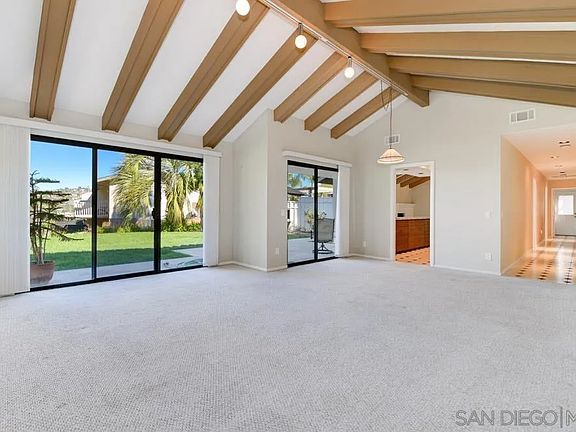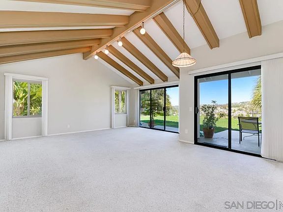 Upon entry to your single story, 3B, 2b 1,750 sq ft Condo in 92009, you'll be drawn to the living room where an expansive view of the gold course and hills greets you and seamlessly takes you from the living room to kitchen, dining area and family room where the fireplace lights up the open area and kitchen. Beautiful bamboo cabinetry creates a timeless design in the kitchen. The high, beamed ceilings provide that airy, open feeling that allows even a large crowd a comfortable space. Already you are imagining all of the amazing indoor-outdoor events you will host with the open flow of the space. Imagine the sunsets whether you are hosting a party or enjoying the calm alone. Your privacy is guarded as the primary bedroom is thoughtfully separated from the other two bedrooms by the main hallway. In your ensuite, you'll enjoy that same luxurious bamboo cabinetry providing ample storage. Take a look at the garage if one of your priorities is storage space. Without the burden of an HOA, you will enjoy your life in this more affordable, welcoming home that has been very well loved by the same owner since 2005.