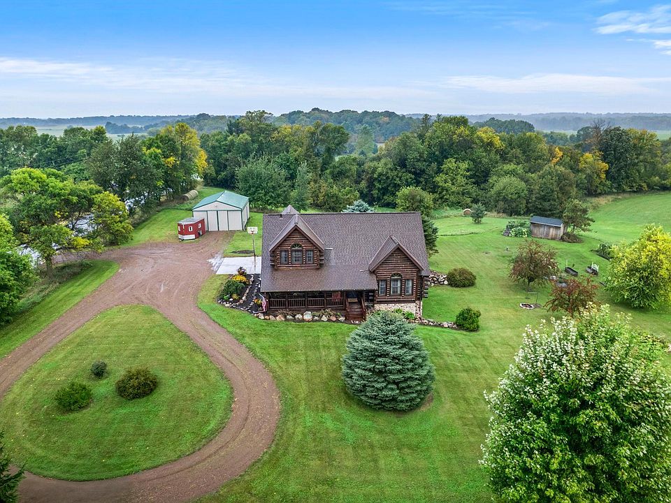Discover the rare charm of a timber log home, beautifully set on three acres. Built in 2005, this home captures the rustic lodge feel while offering thoughtful updates that make it move-in ready & built to last. Welcoming you w/an open-concept design, anchored by custom hickory cabinetry and a spacious island-perfect for entertaining, & gathering w/family & friends. Durable flooring flows throughout, creating a warm & inviting atmosphere. At the heart of the home, a stunning rock fireplace crafted w/St. Croix Stone paired w/ Heat & Glo insert, offering cozy comfort year-round. Upstairs, creates a relaxing retreat feel, while the lower level features in-floor heating along w/garage having in-floor heat. Major updates between 2022-2024 includes heating system, central air, hw heater, roof, & exterior stain. Added conveniences include security system for peace of mind. A 2017 shed with electricity & jug room adds versatility for hobbies or storage.