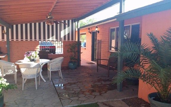 This house a versatile floor plan and is perfect for a large family, shared student housing or Group home. It has 5 full bedrms and 4 ba. This home features real wood floors in all rooms except 3 of the smaller bedrooms. Outside features includes large front patio-perfect for bbq's, in ground spa large enough to be considered a pool, large covered back patio. This home has a gated entrance with remote. Plenty of off street parking.
