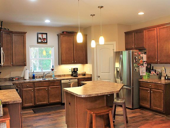 - Kitchen: Bar, Counter Tops-Formica, Eat In, Pantry, Island, Cabinets-Stained, Floors-Vinyl, Recessed Lights