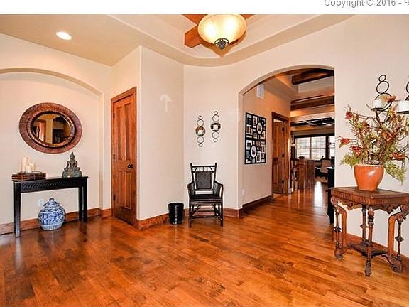 Upscale ranch style home in Prestigious Pine Creek. Walk into luxury! Gorgeous wide plank hardwoods, wood beam ceiling, 5 inch trim, built-in speaker system (including on back patio), custom 6 panel wood doors, gas log fireplace with stunning stone surround, theater room with grand wet bar, formal dining room with carpet inlay, main level master suite, main level laundry and main level office. Kitchen boasts 6 burner gas range, built-in microwave, wall oven, slab granite counter tops, stainless double sink, china...