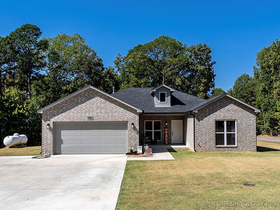 Welcome to Flint Ridge Gated Community! This Full-Brick Home is better-than-new with custom features to include gas fireplace, furnace automatically switches to gas emergency heat for heat pump in extreme cold temps, gas grill hookup on back porch, hot tub pad & panel, and a 50-amp service on house for shop or RV hookup. The aerobic sewer system serves to irrigate the beautiful sod lawn! This is a nice privacy floor plan with open Living & Kitchen w/soft close cabinetry, 3 bdrm and 2 baths plus an office/bonus room. Kitchen appliances convey including refrigerator and range/convection oven w/air fryer & gas cooktop. Primary bedroom has a very nice bath w/tiled walk-in shower & a walk-in closet, Granite counters throughout the home. 4 TVs convey (3 in bdrm & 1 in office). Located in the heart of the Ozark foothills, pristine fishing on Upper Illinois River and where ATVs are a way of travel, community lakes and golf course all in this 7,000-acre gated community with 24-hour security! Paved street and fiber optic! Easy access to Cherokee Turnpike to Tulsa and just 20 minutes to NW Arkansas.