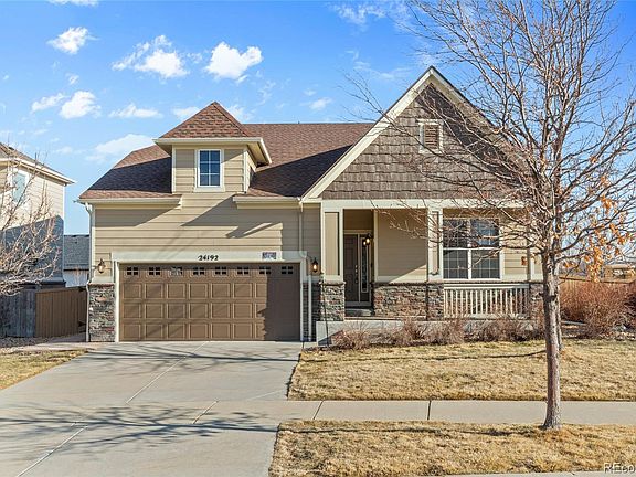 Welcome to 24192 E Alamo Drive, Aurora, CO 80016, a beautifully maintained home in the highly desirable Sorrel Ranch community. This exceptional property offers 2 bedrooms plus a versatile 3rd room—perfect as an office or unconventional bedroom—featuring elegant French doors. Step inside to find fresh carpet throughout the main level, coffered ceilings, and an open floor plan filled with natural light. The kitchen is a chef’s dream, boasting granite countertops, a large island, double ovens, and a gas range. The inviting living room features an electric fireplace and built-in surround sound, making it the perfect space to relax or entertain. The primary suite is a true retreat, offering a 5-piece bath and a spacious walk-in closet. Outside, enjoy year-round comfort with a covered deck equipped with ceiling fans, plus a walkout basement leading to a private jacuzzi and firepit. With a new hot water heater (March 2024), newer roof, new gutters, and a furnace & AC replaced in 2021, this home is move-in ready with major updates already taken care of. Situated on a premium corner lot, this home also provides access to the community pool and clubhouse. Don’t miss this incredible opportunity in Sorrel Ranch—schedule your showing today!