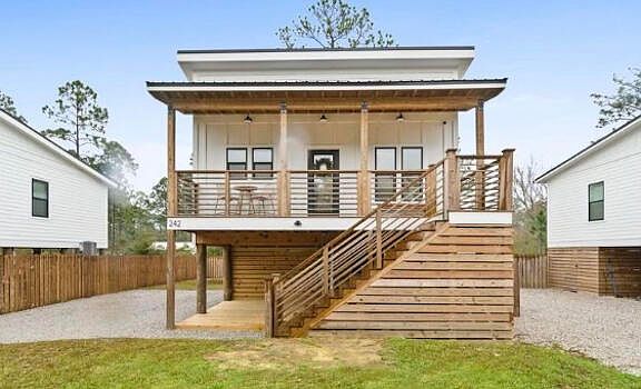 Outside, the home transforms into a private sanctuary, boasting an added outdoor living area beneath the house, creating the perfect backdrop for leisure and entertainment. The large front porch balcony is a dreamy spot for basking in the glow of the Florida sunsets, and the partially fenced backyard offers ample space for gatherings or a tranquil retreat.
