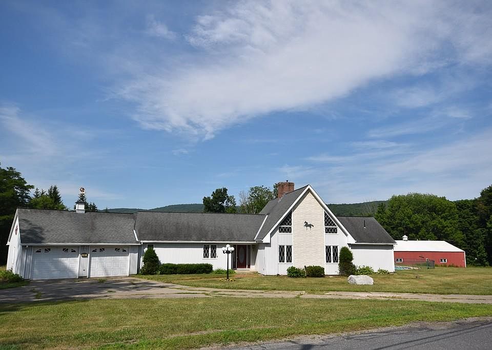 Striking contemporary home on 2.51 acres with in-ground pool & large butler-styled barn located perfectly for travel on I-91 to points North & South.House has 2 bedrooms, bath & a master bedroom with bath. There is a first floor laundry, an attached two-car garage. The 3-season sun room overlooks grassy acreage & views of the surrounding hills.The kitchen is a lovely bright room with an island & room for a small table or sit at counter. Also, there is a family room which leads to sun room & there is a separate dining room. The living room has cathedral ceilings, a fireplace with a gas insert stove & a slider leading out to deck & in-ground pool.. The only 2nd floor space or loft is presently used as an office; could be additional sleeping space/music room/library, etc. Land is perfect for pets, sustainable gardening or just enjoying. Barn use is restricted to a personal shop/storage/hobbies. House & grounds need loving care to bloom again. Offered well below assessed value.