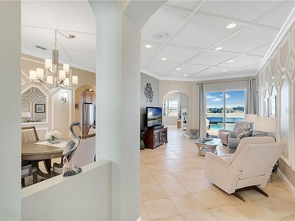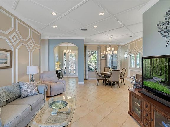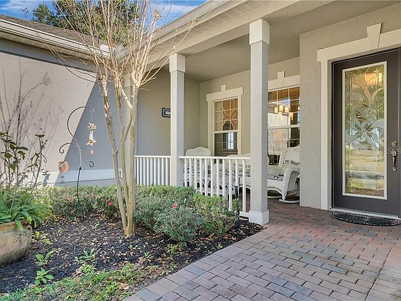 BEST LAKEFRONT VIEW IN THE COMMUNITY! This stunning 3-bedroom, 2-bath POOL home with 2,123 sq. ft. and a 2-car garage in the highly desired 55+ Trilogy community is a former model home and loaded with upgrades! This home boasts wonderful curb appeal, with its paver-laid driveway and charming front porch. Stepping inside through the leaded glass front door and into the grand foyer, you will be greeted by a picturesque, panoramic view of Schoolhouse Lake. Enjoy formal living and dining and being surrounded by beautiful interior finishes such as tall baseboards, custom crown molding, intricate trim work, and chair rail throughout the entire home on all walls and ceilings. The kitchen is a chef's dream with 42" custom cabinets, high-grade GRANITE countertops, stainless steel appliances, mosaic tile backsplash, pendant lighting, and a matching wine bar with a built-in wine fridge. The kitchen opens to a family room/dinette space that could be used as an additional dining area and overlooks the pool deck and lake. Retreat to the luxurious master suite, which offers a spacious bedroom with gorgeous lake views, his and hers walk-in closets, and an adjoining bath with dual solid stone countertop, a garden tub, and a separate walk-in shower. Two additional bedrooms and a pass-through full bath with a privacy door to the tub/shower provide plenty of room for guests. Crafters will love the hobby room, which could be used as an office and features custom built-in cabinets. Step through the double-glass sliders out to the pavered and screened lanai to relax on the roomy patio and enjoy the peacefulness of the lakefront or take a refreshing swim in the SOLAR HEATED pool. Enjoy additional upgrades throughout including wood-look tile in the bedrooms, custom tile work in the bathrooms, detailed mosaic tile work in the foyer, formal dining room, and doorway transitions, overhead storage racks in the garage, and a security system and intercom. HOA DUES include Cable TV, High-Speed Internet, Security System, Landline, and Landscape Service. In addition, Trilogy offers resort-style living with its 57,000 sq. ft. Magnolia House, restaurant, indoor and outdoor pools, fitness center, tennis, pickleball, bocce, 24-hour guard-gated security, and more. Don't miss your opportunity to call this beautiful home yours! Call today to schedule your appointment to see this home.