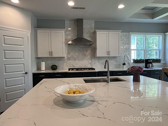 Highly sought-after community of Killian's Pointe. Centrally located near Lake Norman, airport, and Charlotte. Killian's Point boasts a nature trail, community pool, and dog park. Town Center offers Publix, Harris Teeter, Food Lion, Lowes, Walmart, and several fine dining. Open floor plan with windows throughout, making the chef kitchen, dining area, family room, bar, and covered deck a perfect place to entertain friends and family. The kitchen includes a large quartz island, gas cooktop, double oven, cabinets with rollout trays, marble backsplash and a large pantry. The dining area features a coffered ceiling with sliding doors to the covered deck. Step into the vaulted family room and relax by the linear gas fireplace, wood mantel, and custom cabinets. Primary suite has a tray ceiling, pocket door leading to the bath with a garden tub, large quartz vanity, and shower. 2 additional bedrooms, full bath and laundry room. Enjoy the outdoors on the covered deck and patio.