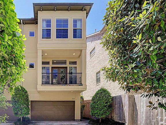 Tastefully updated in the heart of Rice Military desirably situated in the gated community of Detering Plaza, w/ lots of guest parking. Welcoming entry foyer w/ travertine floors & coat closet. 1st floor has 1 of 2 secondary bedrooms w/ en-suite bath, walk-in closets, & a private outdoor terrace. Staircase w/hardwood stained floors & iron railing leads up to the generous sized living, dining, kitchen area w/10 ft. ceilings, crown molding, baseboards, natural stone surround fireplace between 2 built-ins, & french doors that open to a balcony perfect for a table, plants, or grill. Open island kitchen w/ breakfast bar is a cooks dream w/stainless appliances, 42" top cabinets, gas cooktop, & lots of storage. 3rd has primary bedroom retreat w/10 ft. tray ceiling, 2 walk-in closets, & bathroom w/2 separate vanities, cabinet storage, & tub w/separate shower w/tile design & private water closet. Close to Memorial Park and Buffalo Bayou Park!