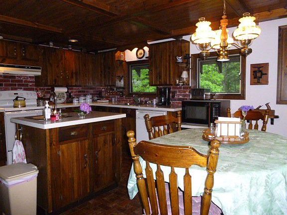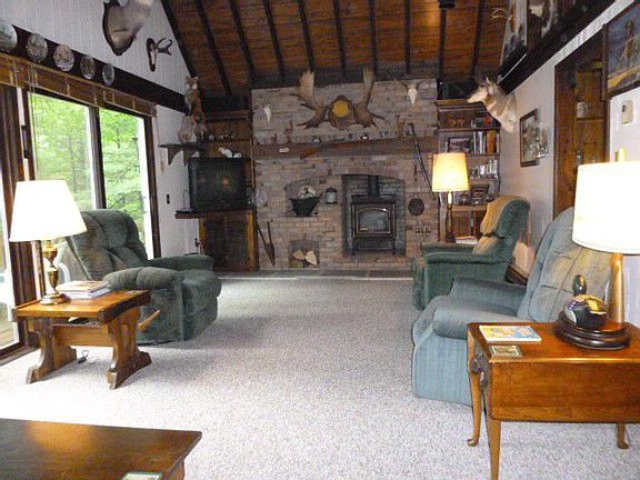 Unique and private setting adjoining State Game Lands, perfect for a quiet getaway. Pleasant living room with vaulted ceilings and fireplace with wood stove. Well organized eat in kitchen features beamed wood ceilings, all modern appliances, center island. Large master bedroom feature 2 closets, one a walk-in. Loft bedroom with attic storage. You will love the wonderful outdoor decks on both front and back of the house, plenty of space for entertaining. Detached 4 car garage and shed. You don't want to miss this gem!