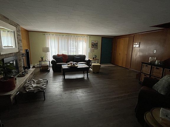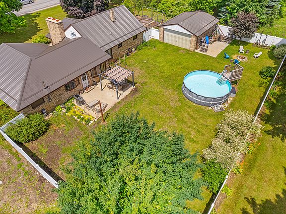 Four bedroom brick home on corner lot just outside city limits with mid-century modern flair. Living room features cool nooks & fireplace & flows into formal dining area. Breakfast area w/backyard views, main level laundry, 2 full baths. 2 bedrooms on main floor, 2 above. Lower level features 2nd fireplace & is prepped for drywall. 26' x 24' attached garage is insulated & finished. 2ND garage is 20' x 28' w/cement pad on side. Large, private corner lot with vinyl fencing, cement patio, pool & firepit. Grow your own food in the expansive raised garden beds. NEW steel roof, NEW 5'' well, NEW pressure tank, NEW circuit breaker panel, NEW insulation & NEW front door - well maintained. Enjoy an easy walk to town without city taxes.